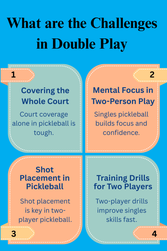 Covering the entire court by yourself is one of the most difficult tasks in two-person pickleball. You don’t have a partner to cover half the area or block shots. This may seem challenging at first, particularly if you are used to doubles. However, you can read the ball more accurately and move more quickly with experience.